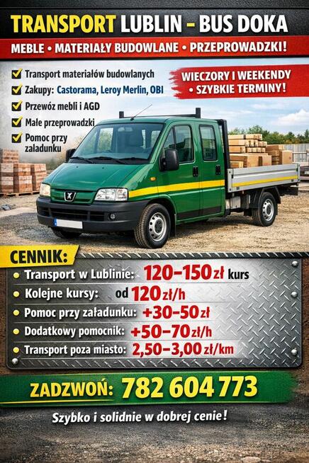 Oferuję transport busem typu doka (otwarta paka) na terenie Lublina i okolic. • Transport materiałów ...